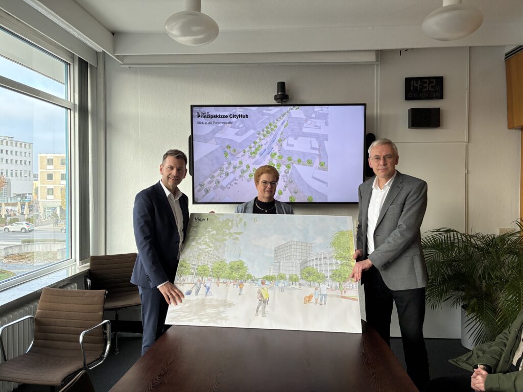 Bild 1: Oberbürgermeister Dennis Weilmann (links) präsentierte gemeinsam mit Ulrike Thumann (Stv. Leiterin Geschäftsbereich Straßenbau und Projektkoordination) und Kai-Uwe Hirschheide (Erster Stadtrat und Stadtbaurat) die Planung für die Neugestaltung des ZOB. Foto: Stadt Wolfsburg Bild 2: So könnte es mal aussehen: Der CityHub als einer von zwei neuen zentralen Umstiegspunkten, die den heutigen ZOB ablösen sollen. Der Standort ist Mitten auf dem Nordkopf, Blickrichtung Süden (die Porschestraße hinunter). Visualisierung: Stadt Wolfsburg Bild 3: Der CityHub aus der Vogelperspektive. Hier sind vor allem die Planungen für einen Autofreien Nordkopf gut zu erkennen. Visualisierung: Stadt Wolfsburg.