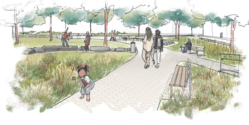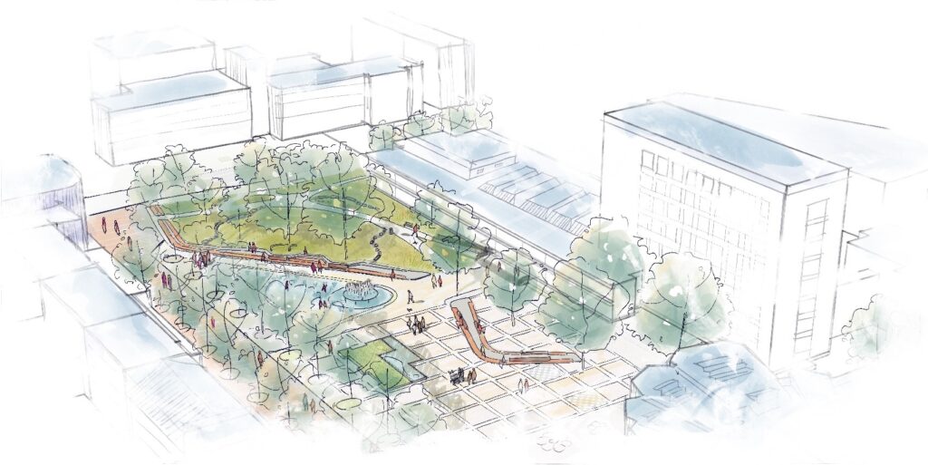 Bild 2: Mitten auf dem Rathausplatz, Blickrichtung Norden (Pestalozziallee): Gut zu erkennen ist die geplante Entsiegelung, viel Grün, Aufenthaltsbereiche und naturnahe Spielangebote für Kinder. Visualisierung: Stadt Wolfsburg